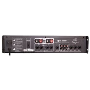 Amplificador para sonorização ambiente, podendo trabalhar em 4 ohms 300 + 300w rms ou 70 volts 300w rms . Gongo ding-dong c.V.I. Especificações técnicas Entradas: 2 microfones mic1 e mic2 com a função mic priority m.P. E c.V.I. 1 microfones mic3 p10 c.V.I. 2 entradas auxiliares in com conectores p10 canais l/r 2 entradas auxiliares a1 e a2 com conectores rca estéreo s.A E c.V.I. Saídas: 2 send com conector p10 1 remote aciona o gongo a distancia 1 auxiliar line out com 2 conectores rca mono 2 output a e output b com borne positivo e negativo e c.V.I. 1 saída 70v quando output a e output b são ligadas em bridge caixas com trafo de linha 70v respeitando potência máxima e perdas com cabos. Equalizador: 3 bandas - low, mid, high Consumo total à potência máxima: 840 w rms Proteção: alto-falantes / fusível / overload - sobrecarga e curto Alimentação:127/220v Dimensões mm : l 485 x h 90 x p 425 Peso kg : 7,8 Homologação Anatel: 170222003229 Ean: 7908481203152