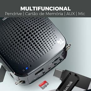 · Potência: 15W · Entradas: USB / SD Card / AUX · Conexão: Cabo / Bluetooth 5.0 · Microfones: com fio com 1,2 metros · Alimentação Bivolt Automático: 110/220V · Clip e presilha: traseira · Bateria de Lítio Recarregável: 2.200mAh