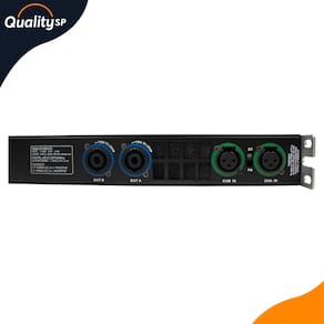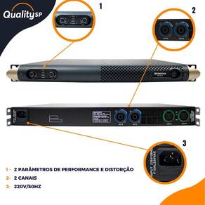 Especificações Técnicas: • 2 Canais • Amplificador Classe D • Distorção / Parâmetros de Parâmetros de performance: <0.005% • SNR 112dB (ponderação A) • Resposta de frequência 20Hz-20kHz +/-0.25dB • Fator Damping >1000 • Taxa de comutação 50V/US • Impedância de entrada 30k balanceado • Sensibilidade de entrada 0.775V • DC residual <5mV • Potência total do amplificador 1500W (750W por canal) • Consumo de energia >0.950>500W • Voltagem/Corrente máxima de saída 100V de pico • 50A de pico • Fonte de alimentação AC 220V • Energia modo de comutação padrão com PFC (correção do fator de potência) ativo