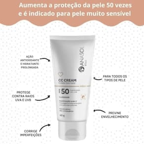 Com 10 benefícios em um único produto, Anasol cc Cream Facial fps 50 combina maquiagem e tratamento. Sua cobertura natural com cor de base embeleza a face e melhora a uniformidade da pele disfarçando as pequenas imperfeições. Além disso, melhora a hidratação, a elasticidade e a firmeza da pele promovendo ação antirrugas. é fácil de espalhar, tem toque sequinho e ajuda a prevenir queimaduras solares causadas por raios uvb, assim como manchas e rugas causadas por raios uva. Contém proteção uva equivalente a 1/3 do fps uvb. Indicado para peles muito sensíveis a queimaduras solares, aumenta a proteção da pele 50 vezes. Produto oil free, não comedogênico, sem fragrância, formulado de maneira a minimizar possível surgimento de alergia. Marca: DAHUER LTDA