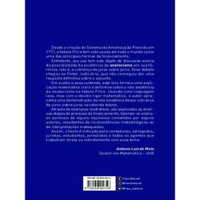 Anatocismo: uma prova da sua inexistência no Sistema de Amortização Francês (Tabela Price), de Orivam Ibiapina Da Silva, é uma obra que trata da inexistência de anatocismo, isto é, cobrança de juros sobre juros, na Tabela Price, fornecendo, para isso, uma explicação clara e objetiva sobre a não existência dessa cobrança na referida tabela.Organizado em oito capítulos, o livro aborda, por meio de exemplos ilustrativos, o percurso metodológico do processo de financiamento, explicando suas diversas etapas e analisando os principais equívocos cometidos na demonstração da ocorrência de anatocismo no Sistema de Amortização Francês.