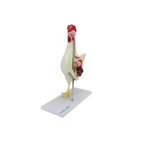 Modelo da anatomia da galinha dividido em 6 partes, possui dimensões naturais de um animal adulto; confeccionado em diversos materiais (resina plástica, PVC, materiais naturais), pintura feita totalmente a mão e com grande riqueza de detalhes anatômicos; O modelo da anatomia da galinha SD-9300 possui órgãos interno que se dividem em: