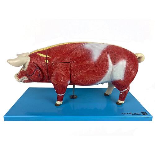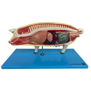 Modelo da anatomia do porco em 18 partes. O modelo apresenta com riqueza de detalhes as estruturas anatômicas da cabeça, tórax e abdômen. Os órgãos internos são removíveis, permitindo visualizar musculatura. Confeccionado em resina plástica de alta qualidade, montado sobre base.