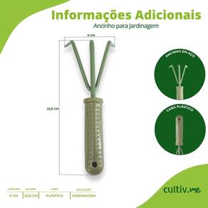 Características * Aço de alta qualidade: maior durabilidade e resistência ao uso diário. * Cabo ergonômico: confortável para segurar e com visual exclusivo. * Ferramenta leve e prática: ideal para tarefas rápidas e precisas na jardinagem. * Tamanho compacto: facilita o manuseio e o armazenamento. * Largura do Ancinho: 9 cm * Altura total: 22,8 cm * Material do cabo: Plástico estampado * Material do Ancinho: Aço * Indicação de uso: Jardinagem em geral (vasos, canteiros, hortas)