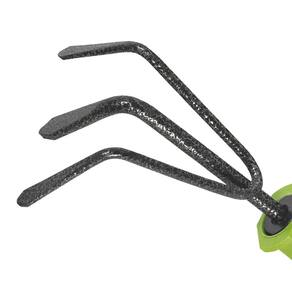 Ancinho pequeno de 3 dentes com cabo em plástico. A largura é de 100 mm e o comprimento total de 225 mm. Projetado para afofar o solo e fazer aeração em canteiros de horta e flores pequenos, feita de aço ?8 e pintada de esmalte de efeito do martelo para impedir corrosão. Após o uso é preciso limpar a ferramenta de resíduos do solo e de outro lixo.