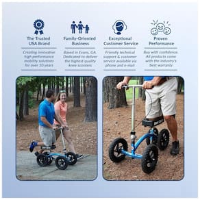 A MARCA COMPROVADA DOS EUA A KneeRover desenvolve soluções de mobilidade inovadoras nos EUA há mais de 10 anos. Nossas patinetes de joelho ajudaram centenas de milhares de clientes a se recuperar com segurança com mais liberdade de mobilidade. LIBERDADE TODO O TERRENO O KneeRover QUAD é a scooter de joelho All Terrain com 4 pneus cheios de ar, proporcionando máxima liberdade de mobilidade para navegar em sua casa, trabalho e qualquer terreno com facilidade incluindo grama, cascalho, sujeira e lacunas nas calçadas. ESTABILIDADE E CONTROLE SUPERIORES A scooter de joelho direcionável KneeRover apresenta uma tecnologia avançada de direção de barra de direção para fornecer estabilidade superior durante a direção. O robusto andador de scooter todo o terreno de 4 rodas possui freios a tambor traseiros confiáveis e freio de mão de travamento para excelente estabilidade e controle durante a navegação. Recomendamos uma velocidade de caminhada segura de menos de 5 km, h. TOTALMENTE AJUSTÁVEL E FÁCIL DE ZENAR A alternativa de muleta para scooter Knee Rover Off road oferece uma joelheira e guidão ajustáveis e é recomendada para usuários com altura de 1,5 a 2 metros. Este andador ajoelhado também se dobra rapidamente para facilitar o transporte e pode caber em carros compactos. DESEMPENHO PESADO O Knee Rover All Terrain pesa 12 kg e sua estrutura de aço resistente suporta até 158 kg de capacidade de peso. Esta alternativa versátil para muletas é ideal para indivíduos que se recuperam de um pé quebrado, tornozelo quebrado, perna quebrada, cirurgia no pé ou cirurgia no tornozelo Marca: Não Informado
