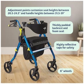 PREMIUM ROLLING WALKER COM ASSENTO DE ESPUMA DE MEMÓRIA CONFORTÁVEL Quando você precisar de uma pausa para caminhar ou ficar de pé, descanse no assento extra largo em espuma de memória ou vire o encosto, trave os freios e sente se confortavelmente com apoios de braço APRESENTA TODOS OS ACESSÓRIOS QUE VOCÊ PRECISA Equipado com um porta copos conveniente que é ajustável e dobrável, bolsa removível para zenamento de assento que contém acessórios pessoais para manter as mãos livres, organizador de bandeja e fita reflexiva para segurança LEVANTAR O BANCO E ENTRAR NO ANDADOR PARA ACESSAR BALCÕES OU PIA Uma trava simples do assento permite que os usuários levantem o assento, permitindo espaço para entrar no andarilho. Freios de estilo de loop convenientes que podem ser empurrados para baixo para travar e puxados para cima para liberar Marca: Não Informado