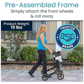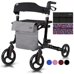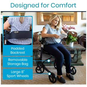 SUPORTE E ESTABILIDADE SUPERIORES Resistente e durável, o andarilho Vive oferece suporte estável, manobrando facilmente sobre qualquer tipo de superfície com grandes rodas esportivas de . A altura da alça é ajustável para um ajuste personalizado para cada indivíduo. Suportando até 136 kg, a estrutura de alumínio é resistente à corrosão e dobra para fácil zenamento e transporte. Inclui um assento e encosto largos para descansar confortavelmente em movimento.