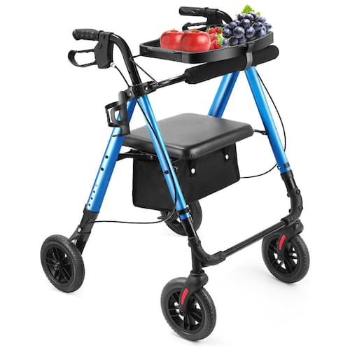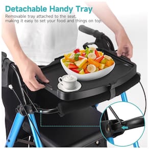 Design leve para facilitar o transporte: o andador rollator Ambliss com assento pesa apenas 8,1 kg. Seu mecanismo de dobra com um toque permite que ele seja dobrado rapidamente, garantindo facilidade no transporte para viagens e uso diário. Nosso andador de 4 rodas é projetado com uma estrutura reforçada e barras de suporte duplas, capaz de suportar até 136 kg. O assento acolchoado proporciona conforto prolongado durante o sentar. A altura do assento e das manoplas é ajustável, permitindo que idosos personalizem a postura e o conforto de acordo com suas necessidades individuais. Segurança aprimorada com rodas de 20 cm: as rodas com 20 cm resistentes a perfurações proporcionam manobrabilidade de 360 graus, estabilidade aprimorada e absorção de choque superior em superfícies irregulares. Os freios traseiros traváveis evitam rolagem acidental durante as transições sentado/em pé, aumentando a segurança geral. Bandeja removível e cesto de armazenamento: o andador rollator com assento inclui uma bandeja removível para facilitar a colocação de alimentos e itens pessoais. Além disso, o cesto de armazenamento reforçado permite que os usuários carreguem itens essenciais como mantimentos ou suprimentos médicos com facilidade.