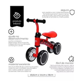 seguro: sem pedais e com rodas totalmente fechadas que evitam que a criança prenda os pés. Possui uma direção limitada a 135 graus evitando que a criança caia. Não possui parafusos expostos para evitar arranhões ou machucados. Seus pneus evitam escorregões e são resistentes