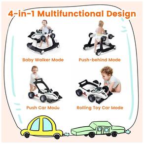 Andador 4-em-1 para bebê: Este andador é projetado para bebês de 6 a 18 meses, ajudando-os a aprender a andar, fortalecer os músculos das pernas e mais. Pode ser facilmente transformado de andador para modo de empurrar, carro de empurrar e modo de carro de brinquedo. Segurança confiável: Este andador de atividade para bebês possui um para-choque de segurança em distância segura para proteger a cabeça do bebê de colisões. O encosto ergonômico de alta suporta totalmente a coluna do bebê. Além disso, cinco pés antiderrapantes aumentam a segurança. Altura ajustável em 3 níveis e almofada de assento confortável: O andador de carro para bebês oferece 3 posições de altura ajustáveis para se adequar a bebês em diferentes alturas e estágios, permitindo que eles pratiquem andar sem curvar as pernas. A almofada do assento também previne efetivamente as pernas em O. A almofada é removível e lavável para facilitar a limpeza. Rodas flexíveis com velocidade ajustável: Quatro rodas universais suaves e silenciosas garantem movimento flexível para uma melhor experiência, sem perturbar os outros. Além disso, você pode apertar as rodas traseiras no sentido anti-horário para acelerar, no sentido horário para desacelerar ou travar. Centro de atividades e design dobrável: O volante, a alavanca de câmbio, o espelho retrovisor e os botões de luz oferecem uma experiência realista de direção para o bebê. A música vívida e as luzes ajudam a estimular os sentidos do seu filho. Quando não estiver em uso, você pode dobrar o Andador de Atividade e armazená-lo facilmente sob o sofá ou a cama.