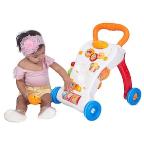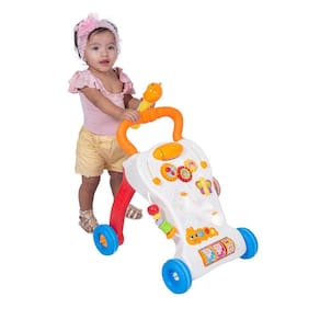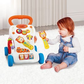 O andador didático Songs possui diversos brinquedos inclusive um microfone multifuncional com sensor de movimento que faz sons ao ser chacoalhado e toca músicas, assim como vários brinquedos que produzem sons e luzes e estimulam todos os sentidos! Mais tarde o andador pode ser utilizado para bebês que já ficam em pé para começar a caminhar!