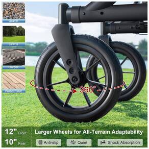 Rodas de Borracha de 12 Polegadas: O andador MAXWALK possui rodas grandes (12" na frente, 10" atrás) com giro de 360° para rolamento suave. As rodas são antiderrapantes, com absorção de choque, ideais para ambientes externos, como estradas esburacadas, cascalho, concreto, grama e outros terrenos irregulares.