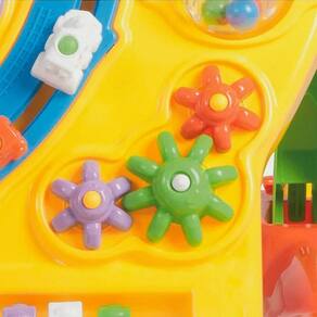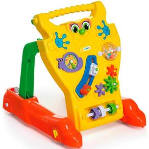 O andador é mais do que um suporte: é um centro de atividades interativo. Ele vem com um painel frontal que pode ser removido e utilizado para a brincadeira, com engrenagens que giram e bolinhas que pulam, o que incentiva a percepção de causa e efeito e o raciocínio lógico.