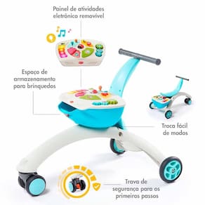 Andador Infantil - 5 em 1 - Triciclo - Azul - Tiny Love: O Andador e Triciclo 5-em-1 da Tiny Love possui todos os principais recursos para mobilidade em um único produto, além de um mecanismo de controle de velocidade para garantir que o bebê tenha segurança em seus primeiros passos. Também conta com luzes e sons em um painel eletrônico com atividades. Com 5 funções: brincar, caminhar, empurrar, ficar em pé e sentar Detalhes: • Painel eletrônico de atividades removível para brincar em qualquer lugar • Luzes e Sons • Cresce com o bebê • Ajuste as rodas para acelerar ou desacelerar o mecanismo de segurança • Cesto para levar objetos preferidos do bebê • Super versátil • Rodas revestidas em material macio • Fácil alternar entre as funções com apenas um clique Andador e Triciclo 5 em 1: • A partir dos 6 meses: SENTAR E BRINCAR Deixe seu bebê aproveitar a coleção de atividades do painel eletrônico, incluindo a bola, esconde-esconde e espelho, botões e interruptores, bola giratória com miçangas, luzes e feedback musical, que promovem habilidades motoras finas e desenvolvimento cognitivo. • A partir de 10 meses: BRINCAR DE PÉ O bebê pode se levantar, ficar em pé e continuar brincando com o painel de atividades a partir da nova posição -- desenvolvendo o seu equilíbrio e fortalecendo os músculos das pernas Não vai demorar muito para que ele dê os primeiros passos! • A partir de 10 meses: ANDADOR O bebê fica por trás do brinquedo, segurando a sua alça e, graças ao controle de velocidade, pode caminhar com segurança -- desenvolvendo ainda mais o equilíbrio e a força muscular das pernas, se preparando para uma futura caminhada independente. Ajuste as rodas para desacelerar no modo de caminhada e deixe seu pequeno explorar os primeiros passos com um apoio extra usando o freio de segurança. Quando o bebê estiver andando com mais confiança, você pode alternar para o modo mais rápido. • A partir de 15 meses: TRICICLO A criança pode se sentar no triciclo e usa os pés para avançar -- aprendendo a andar enquanto controla o equilíbrio • A partir de 18 meses: BRINQUEDO DE EMPURRAR Como um brinquedo de empurrar, ele é companheiro perfeito para brincadeiras criativas. Apenas deixe seu pequeno se divertir empurrando sua boneca, enchendo a cesta com carros ou dando uma volta Informações: • Produto: Andador e Triciclo 5 em 1 • Marca: Tiny Love • Tipo: Andador Infantil • Tamanho do Produto (C x A x L): 45 x 57 x 37 cm • Categoria: Brinquedos para Bebês • Subcategoria: Andadores e Primeiros Passos • Peso suportado: até 25 kg • Conteúdo: 01 Andador e Triciclo 5 em 1 • Recomendação: para crianças a partir de 06 meses de idade Especificações: • Referência: IMP01820 • Código de Barras: 7290108862461 • Embalagem (C x A x L): 39 x 59 x 23 cm • Embalagem (Peso): 3.3 kg • Material / Composição: ABS, PP, PVC, OS • Alimentação: Utiliza 3 pilhas AAA (não incluídas) • Registro: CE-BRI/IQB 006367 53880/20-001 • Certificado: Órgãos Autorizados - OCP´S (Organismos de Certificação de Produtos) Aviso: • As imagens são meramente ilustrativas • Os tamanhos e medidas são aproximados • As cores e estampas dos produtos podem ter variações • As informações são de responsabilidade do fabricante ou fornecedor Ean: 7290108862461