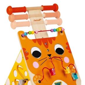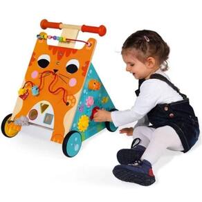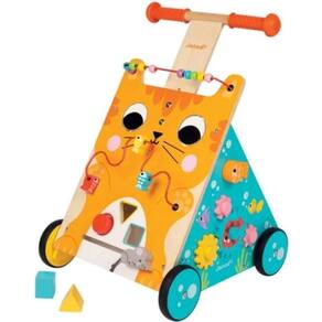 Andador Multiatividades Gato Janod J08005 Abram alas para o amoroso gatinho Este amigo felino está sempre pronto para passear e explorar com as crianças. Com 3 faces repletas de atividades, o carrinho ajuda os pequenos a desenvolver a motricidade e destreza de forma divertida. 8 atividades integram este brinquedo: labirinto de contas, classificador de formas, labirinto lateral, engrenagens, entre outras. Para ajudar também a desenvolver os sentidos, os grandes olhos do gato rodam e as suas bochechas são macias. Pensado para os primeiros passos dos bebés, este carrinho tem um travão que bloqueia as rodas e liberta-as gradualmente de forma a controlar a velocidade durante a aprendizagem.