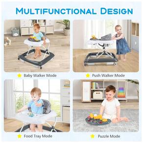 Andador 4 em 1 Multifuncional para Bebê: Modo Andador para Bebê: ajuda a desenvolver o equilíbrio e o senso de direção, incentivando os bebês a explorar e andar para frente. Modo Andador de Empurrar: fortalece os músculos das pernas e promove a caminhada independente. Modo Bandeja para Refeições: conveniente para as refeições do bebê. Modo Quebra-Cabeça: oferece aprendizado educacional e divertido. Adequado para meninos e meninas de 7 a 14 meses.