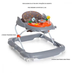 Características: Assento confortável e fácil para limpar Bandeja de brinquedos Regulagem de altura em 3 posições do assento Possui 2 rodas dianteiras giratórias Possui 2 rodas traseiras fixas Possui 6 sistemas de freio Composição têxtil 100 poliéster Produto Nacional Registro do brinquedo no inmetro Nº 004931/2021 Registro do produto no inmetro Nº 005052/2021