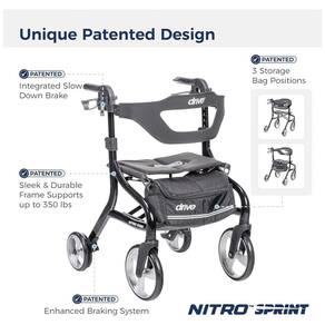 3 Posições de Armazenamento: A bolsa de armazenamento espaçosa pode ser montada em três pontos (barras de apoio e parte frontal ou traseira sob o assento), oferecendo versatilidade. O modelo Nitro Sprint também inclui um suporte prático para acessórios como bengalas, celulares ou um porta-copos.