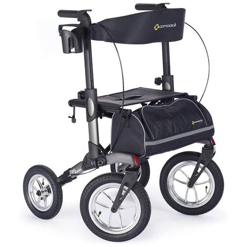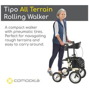 Pneus Todo Terreno - Equipado com rodas de 30,5 cm na frente e 25,4 cm na parte traseira, este andador possui pneus pneumáticos para máxima aderência e tração em diversos terrenos, como superfícies internas e externas, trilhas irregulares, cascalho, pedras e areia firme.
