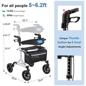 Leve e Robusto - Fabricado em alumínio, o andador pesa apenas 6,7 kg e suporta até 136 kg. O assento espesso e respirável, combinado com o encosto acolchoado, proporciona descanso confortável e seguro após longos períodos de caminhada.
