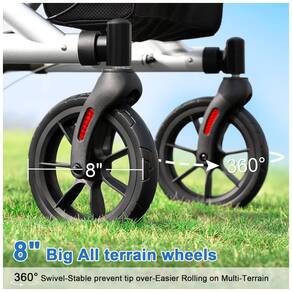 Rodas de 20 cm para Todos os Terrenos - Equipado com rodas dianteiras de 20 cm e padrão antiderrapante, o andador oferece excelente aderência ao solo, prevenindo escorregamentos. As rodas grandes garantem a utilização em diversos terrenos, incluindo calçadas irregulares, cascalho e até mesmo superfícies arenosas.