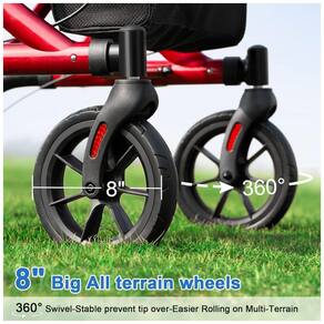 Sistema de Segurança Duplo - O andador vem com um sistema de freios duplos que permite controlar a velocidade facilmente. O freio também pode ser bloqueado, garantindo que o andador permaneça estável enquanto você se senta no assento. Além disso, o padrão antiderrapante das rodas aumenta a resistência e evita escorregamentos.