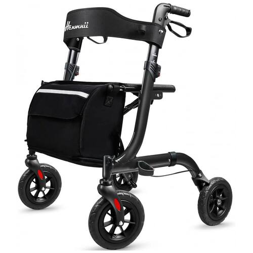 Freios Sensíveis de Dupla Ação: Os freios do andador Henmnii permitem controle suave da velocidade ao descer colinas, aplicando pressão suave para evitar que o andador vá rápido demais. Quando for necessário sentar, basta pressionar os freios para travar a posição do assento. O padrão antideslizante das rodas aumenta a aderência e impede o deslizamento em diferentes superfícies.