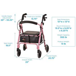 ESPECIFICAÇÕES Altura aproximada do usuário de 1,47 m 1,63 m A altura do assento é de 47 centimetros a capacidade de peso é de 136 kg O peso do andador é de 5,9 kg Altura da alça ajustável de 74 centimetros a 84 centimetros Largura entre as alças 40 centimetros Dimensões gerais 55,9 centimetros L x 60,3 centimetros P x 84,5 centimetros A. Dimensões gerais quando dobrado 89 101,6 A x 55,9 L x 28,6 P centímetros