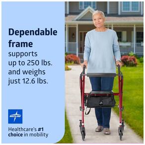 Confiável por profissionais de saúde em todo lugar, o Rollator super leve da Medline, com braços e assento ajustáveis, é o suporte perfeito para idosos, adultos, pessoas idosas e aqueles com mobilidade reduzida. Este Rollator está equipado com rodas de 15 cm para se mover facilmente de ambientes internos para externos, mais suave do que nunca. Possui assento acolchoado preto de 30x30 cm, pesa apenas 5,7 kg, suporta até 113 kg e vem em um chassi de alumínio vermelho. Equipado com amplo espaço de armazenamento sob o assento, este Rollator transporta você e seus pertences de forma segura e conveniente. Para acionar os FREIOS, basta apertar os braços de aderência fácil. Para manter as rodas em uma posição segura e travada, empurre os braços de aderência para baixo. Isso evita que o Rollator se mova quando estiver parado, sentado ou levantando. Ajuste facilmente a altura das alças para um ajuste perfeito a partir de 75 cm. ROLLATOR ULTRA LEVE: Pesa apenas 5,7 kg, mas suporta uma capacidade de peso de até 113 kg, tornando-o seguro e confortável para o usuário e seus pertences. MANOPLAS DE FREIO FÁCEIS DE USAR: As alças ergonômicas são fáceis para idosos e mãos frágeis segurarem, sem serem escorregadias - empurre para FREAR e empurre para baixo para travar as rodas no lugar. ASSENTO E ALÇAS AJUSTÁVEIS EM ALTURA: Assento acolchoado de 30x30 cm ajusta de 46-58 cm do chão; alças ajustam de 75 cm do chão para um ajuste personalizado e vem com armazenamento conveniente sob o assento. CHASSI DE ALUMÍNIO DOBRÁVEL: Transporte facilmente graças ao design leve e chassi dobrável. ROLAMENTO SUAVE DENTRO E FORA: Caminhe facilmente dentro e fora com rodas de 15 cm projetadas para rolar suavemente em qualquer terreno.