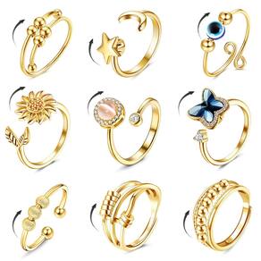 1 - Anéis para ansiedade – você receberá 9 peças de anéis de ansiedade fidget com diferentes estilos, incluindo anel fidget de girassol, anel fidget de zircônia cúbica, anel fidget de borboleta, anel fidget de olho turco, anel fidget de estrela da lua e anel fidget de contas. Formas fofas e designs interessantes trazem uma variedade de opções para usar todos os dias - Anéis de ansiedade para aliviar o desconforto – O anel fidget exclusivo é rotativo, pode girar manualmente muito suavemente e continuar por um bom tempo sem fazer barulho, ajuda você a superar o desconforto e reduzir a ansiedade. Perfeito para alguém que está procurando uma maneira sem distração de redirecionar maus hábitos ou obter energia inquieta quando, de outra forma, você não consegue - Material de latão e tamanho ajustável: estes anéis fidget são feitos de latão de alta qualidade, leves e duráveis, não desbotam ou enferrujam. Embutido com zircônia cúbica AAA+ brilhante, mais deslumbrante e atraente. Design aberto que é muito fácil de ajustar para um ajuste confortável, adequado para a maioria de vocês - Anéis de ansiedade fidget para mulheres – o conjunto de anéis de ansiedade fidget é popular entre todas as idades, adequado para sua esposa, namorada, mãe, filha, família e amigas no aniversário, dia das mães, aniversário, feriados, formatura, Natal, Dia dos Namorados e muitos outros dias especiais - Por que nos escolher: FIBO STEEL é uma marca de joias com uma equipe de design e uma fábrica experiente. Fabricamos apenas alta qualidade, atenção aos detalhes