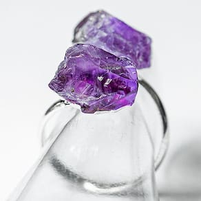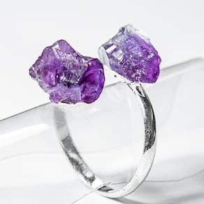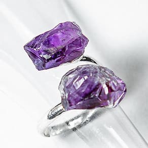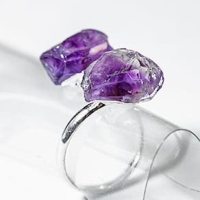 Anel ajustável prateado 2 pedras de ametista bruto, excelente tom de roxo em suas pedras. Beleza e cura natural em uma única peça.
