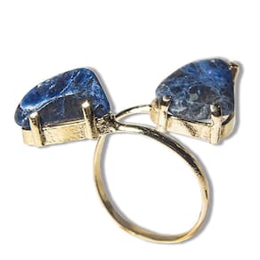 Anel 2 Pedras Sodalita Rolada Natural Aro Ajustável Dourado, Anel aro ajustável com banho dourado montado com 2 pedras Sodalita roladas. Beleza e cura natural em uma única peça. Sodalita é uma pedra que pode produzir fortes mudanças em sua atitude, ela o ajuda a ser mais objetivo e menos crítico a cerca do modo como lidar com a existência e a desvencilharse das armadilhas provocadas por um estilo de vida complicado.
