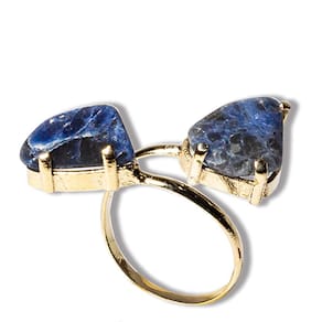 Anel 2 Pedras Sodalita Rolada Natural Aro Ajustável Dourado, Anel aro ajustável com banho dourado montado com 2 pedras Sodalita roladas. Beleza e cura natural em uma única peça. Sodalita é uma pedra que pode produzir fortes mudanças em sua atitude, ela o ajuda a ser mais objetivo e menos crítico a cerca do modo como lidar com a existência e a desvencilharse das armadilhas provocadas por um estilo de vida complicado.