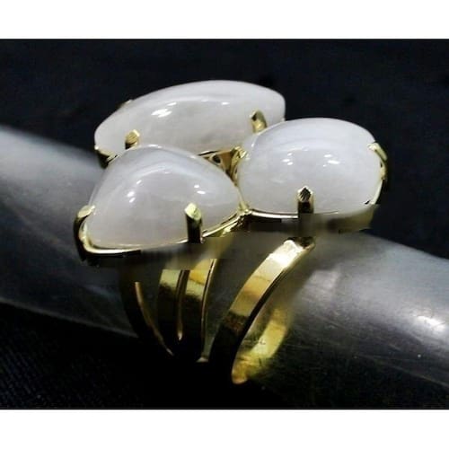 Anel 3 PedraS Quartzo Leitoso Navete, Cabochao Quadrado e Trillion Pedras Naturais, com lapidação manual aro ajustavel ao dedo serve do 12 ao 30 banho flash dourado