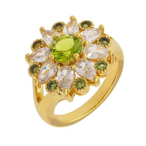- Tipo de item: anel- - Tipo de metal: latão- - Cor do metal: amarelo- - Revestimento de metal: ouro amarelo 18k- - Tipo de pedra: CZ- - Cor da pedra: verde claro- - Forma da pedra: redonda- - Contagem de pedras: 8- - Tipo de pedra central: CZ- - Cor da pedra central: verde claro- - Forma da pedra central: redonda- - Tamanho do anel americano: 6- - Largura da faixa: 3 mm-