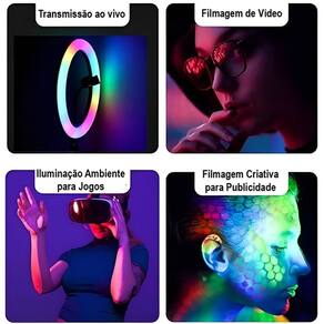 A Ring Light RGB proporciona uma iluminação vibrante e com cores ajustáveis, permitindo que você escolha a cor e a intensidade de luz ideais para cada ocasião. Seja para gravação de vlogs, streaming de jogos, publicidade ou apenas para melhorar a iluminação do ambiente, ela oferece uma iluminação uniforme e sem sombras.
