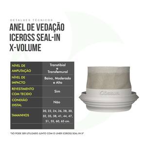 Descrição Comercial: O anel de vedação Iceross Seal-In X é revestido com revestimento de baixa fricção Easy Glide, eliminando a necessidade de álcool spray ou outros lubrificantes para colocação no encaixe da prótese. O Anel de vedação Iceross Seal-IN X pode ser utilizado tanto para membros transtibiais (abaixo do joelho) como para transfemurais (acima do joelho), sempre com o Liner Iceross Seal-In X*. Este anel pode ser flexivelmente posicionado para uma ótima sucção, independentemente da forma do membro residual. Também pode ser movido conforme necessário ao longo do dia para maior conforto. Quando o anel é posicionado corretamente num revestimento Iceross Seal-In X Liner colocado, é mantido em tensão contra as bandas de silicone na superfície exterior do revestimento, depois é comprimido contra a superfície interior da meia protética. Isto cria uma câmara de vácuo distal, que suspende com fiabilidade o membro residual na prótese. O anel está disponível em 3 variantes: Iceross Seal-In X Grip: para um bom controle de rotação; Iceross Seal-In X Volume: acomoda mais redução de volume; Iceross Seal-In X Classic: a vedação clássica do dia-a-dia. Determine qual a sua necessidade e escolha o mais adequado para você ganhar qualidade de vida. Este anel só pode ser utilizado com o Liner Iceross Seal-IN X.