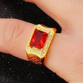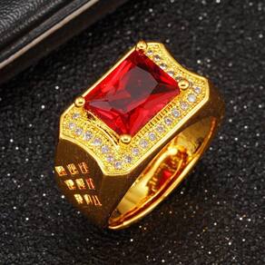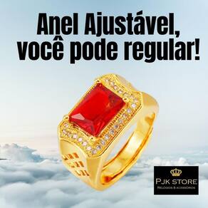 Anel Dourado Banhado Pedra Vermelha Zircônias Ajustável Lindo Anel Ajustável. Perfeito para todas as ocasiões, inclusive para presentear, já que não precisa saber exatamente o tamanho pra comprar. Por ser ajustável cabe perfeitamente em qualquer circunferência anelar. Bela peça com pedra lapidada, acessório imponente, com fino acabamento em zircônias cravejadas. Largura de superfície: 12mm Peso líquido: cerca de 7,2g