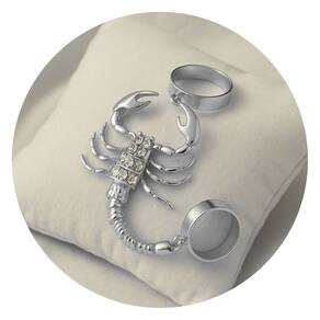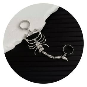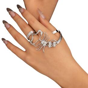 Destaque-se com estilo e ousadia usando este anel articulado em formato de escorpião. Com acabamento prateado e aplicação de strass brilhantes, a peça traz um visual impactante e moderno, perfeito para composições autênticas e cheias de atitude.