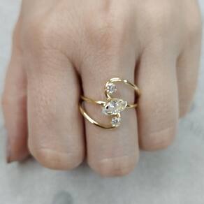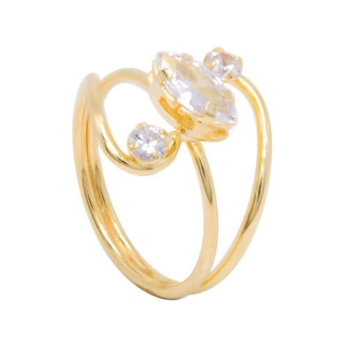 Anel Semijoia com Banho de Ouro 18k, Fio Cruzado com Zircônia Navete Central e duas Pedras Redondas Laterais.