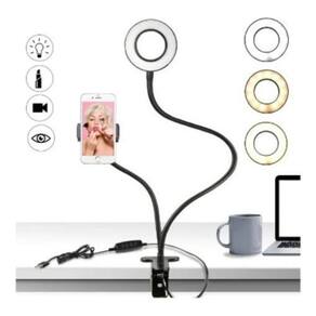 Anel luz iluminador led ring light suporte celular para vídeo muito procurado por maquiadores, barbeiros, fotógrafos e etc, este modelo de ring light vai te proporcionar a iluminação perfeita para fotografar ou gravar seus trabalhos para rede social ou até mesmo se o conteúdo for enviado para seu canal por exemplo. Excelente para criar vídeos ao vivo, seja com smartphone ou computador. Possui configurações de matiz e brilho para obter a iluminação certa. Basta escolher entre 3 modos de luz e 9 níveis de brilho para os seus usos preferidos - maquiagem, flat lay, fotos de selfie, vlogging de cenários escuros etc. Controles de fácil manuseio no cabo para ligar / desligar ou mudar para o modo de iluminação que você preferir. Pode ser utilizado como luminária de mesa. Fotos meramente ilustrativas. Especificações: modelo: professional live stream peso: 480g 3 modos de luz branca, amarela e mista e 9 níveis de brilho potencia: 12w material: aço e plástico abs cabo usb aproximadamente: 1,20m altura máxima aproximada: haste ring light 61,5 cm e haste smartphone 34,5 cm diâmetro aproximado do ring light: 8,5 cm compatibilidade: largura máxima aproximada do suporte telefone é de 8,6 cm conexões: usb 5v itens inclusos: 1 iluminador ring light com suporte articulado de mesa live stream para celular smartphone com controle 1 suporte para o celular smartphone