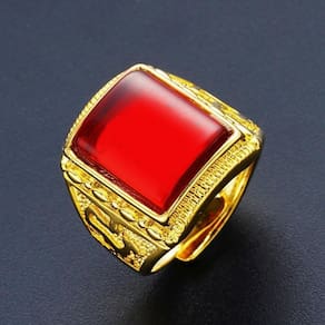 Anel Masculino Dourado Pedra Vermelha Banhado Regulável Lindo Anel Ajustável Banhado a Ouro com Pedra Vermelha Perfeito para todas as ocasiões, inclusive para presentear, já que não precisa saber exatamente o tamanho pra comprar. Por ser ajustável cabe perfeitamente em qualquer circunferência anelar. Bela peça, acessório imponente, multifacetado, com fino acabamento. Largura de superfície: 20mm Peso líquido: cerca de 7,2g