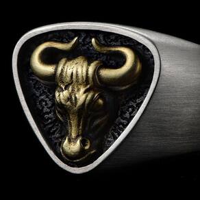 Anel Masculino Prata 925 E Dourado Touro Ajustável