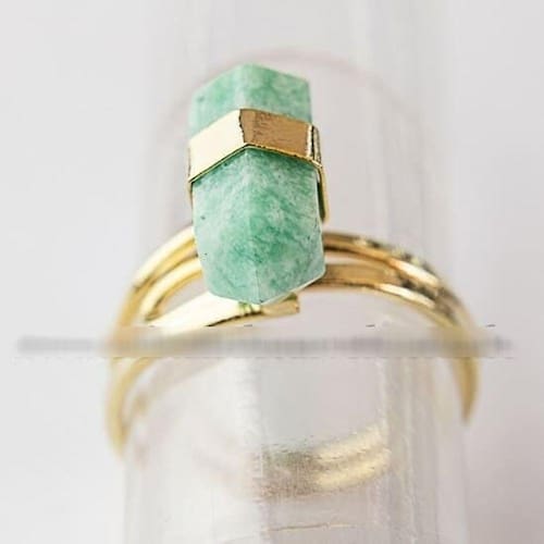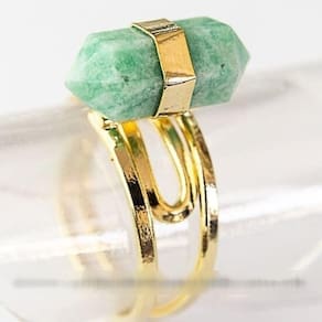 Anel Micro Pontinha Amazonita Verde Bi Ponta Aro Ajustavel Dourado, Anel Pedra Amazonita Verde natural de Garimpo com lapidação Manual Bi terminado Sextavado a montagem é com aro ajustavel ao dedo reforçado com banho em Flash dourado, Lindo brilho serve do 10 ao 30 Bi terminado são pontas com dupla terminação, ideais para usar no recebimento e envio de energia ao mesmo tempo, criando ponte energetica entre os cristais ao redor