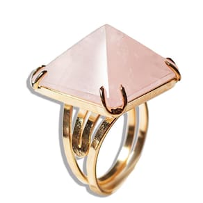 Anel Piramide Baseada na Grande Queops Pedra Quartzo Rosa Lapidação é Manual tipo artesanal com excelente brilho a montagem é com aro ajustavel ao dedo reforçado banhado dourado, Lindo brilho serve do 10 ao 30