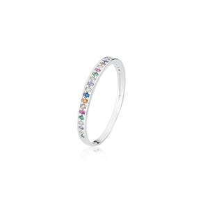 Com uma espessura de 2mm, esse anel é cravejado com zircônias coloridas, que trazem um toque de brilho e elegância à peça. Além disso, as zircônias são super delicadas e não desbotam, mantendo o aspecto de novo por muito tempo.