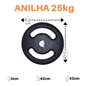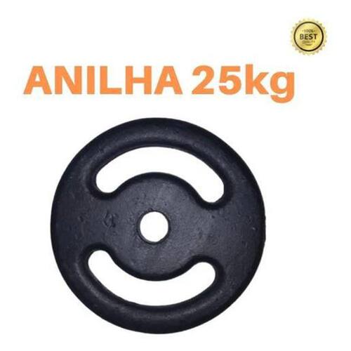 Anilha Super Premium pintada produzida em ferro fundido, possui alça para pegada fácil e ágil facilitando o uso em diversos exercícios além de usa-las nas barras.Com indicador de peso gravado no ferro garante fácil identificação de seu peso.A pintura de alta resistência protege o ferro de oxidação tendo bom uso .Temos um controle de qualidade focado para que todas anilhas comercializadas estejam com peso exato e com perfeito acabamento.CaracterísticasPeso - 25kg Diâmetro do furo central - 3cm Quantidade - 1 unidade Material - Ferro FundidoCor - PretoMarca - Anilhas&CiaLembrando de ter sempre um profissional fazendo o acompanhamento do seu treino. Nossos produtos tem qualidade garantida, fazendo assim com que nossa empresa Anilhas & Cia seja a líder do mercado de equipamentos fitness.Trabalhamos com Anilhas de 01kg, 02kg, 03kg, 04kg, 05kg, 10kg, 15kg, 20kg e 25kg. Temos também diversos produtos fitness como por exemplo: - Anilhas - Barras - KettlebellEntre outros. Marca: Anilhas&Cia