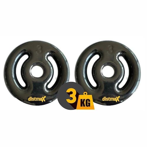 Anilha vazada emborrachada 3kg par Anilha de vinil, é composta por ferro fundido e revestida por vinil emborrachado, facilitando a pegada e a aderência, garantindo assim uma segurança maior nos exercícios e nos movimentos.Cada peso possui alças de fácil manuseio especialmente projetadas para facilitar o movimento, o carregamento e o armazenamento. De alta qualidade e duradoura, cada peso irá beneficiar a sua rotina de exercícios, independentemente da experiência ou do equipamento. O revestimento de vinil emborrachado evita a corrosão, aumenta a durabilidade, reduz o ruído e protege tanto o equipamento quanto o chão. Especificações da unidade: Anilha emborrachadaAlças lateraisComposição: ferro fundido e pvc emborrachado.Diâmetro: 20 cmAltura: 3 cmFuro central: 33 mmPeso: 3 kg Contém: 2 duas unidades um par de anilhas de ferro fundido revestidas por vinil emborrachado, totalizando 6 kg o par.Origem: nacional. Marca: Distmax