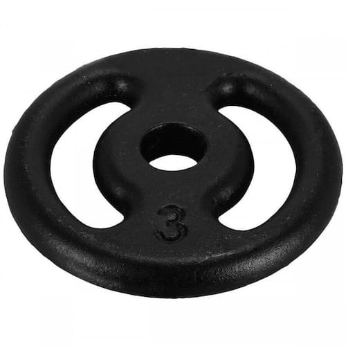 Anilhas Pintadas- Pesos para Musculação 3Kg Anilhas Pintadas Vazadas Comum de Ferro compatível com qualquer barra de ferro padrão podendo ser utilizadas em barras maciças e ocas. As anilhas são fabricadas em ferro fundido, com pintura na cor preta dando um acabamento especial ajudando na proteção contra oxidação. As anilhas possuem marcação da numeração referente ao seu respectivo peso além de possuírem vão para pegada podendo se utilizada em diversas outros exercícios. Especificações Marca: Camarx Ltda Diâmetro: 31 mm a 34 mm Material: Ferro fundido. Cor: preto Peso: 3 kg Anuncio contém: 1 anilha de 3 kg Pintada. Marca: Camarx-Ltda Ean: 7890106014352